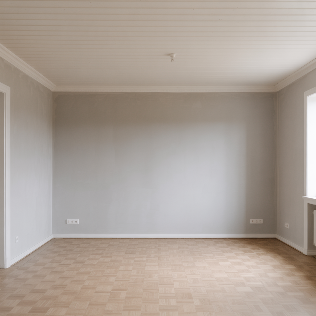 Projektet gällde målning av väggar och tak i Säby, Rönninge, Stockholms län. Beställaren önskade en lugn, sammanhållen kulörbild och en jämnare känsla i ytorna utan att förändra befintliga lister eller elinstallationer. Vi började med att täcka golv och möbler, demontera täcklock där det behövdes och maskera noggrant. För ett mindre plåtbeslag tog vi in extern hjälp från plåtslagare spånga. Underarbetet omfattade tvätt av ytor, skadereparationer samt spackling i två till tre omgångar med mellanslipning (korn 120–180) tills väggar och tak uppnådde rätt jämnhet. Springor mot lister och hörn fogades där det krävdes för att undvika skugglinjer. Innan målning togs en kulör fram genom provstrykning i rummet och stämdes av med beställaren.
